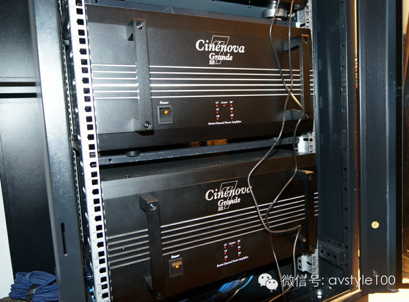 兩臺大地震Cinenova Grande 7 BTL 提供每只喇叭600瓦的瘋狂驅動力,前級通過Integra DHC-80.3來解碼,可以通過80.3解碼輸出DTS NEO:X,Dolby Pro Logic IIz,Audyssey DSX三種不同的11.1聲音格式。OPPO BDP-103作為播放機來播放藍光碟。通過智能中控系統(tǒng)Control 4來控制整個影院。