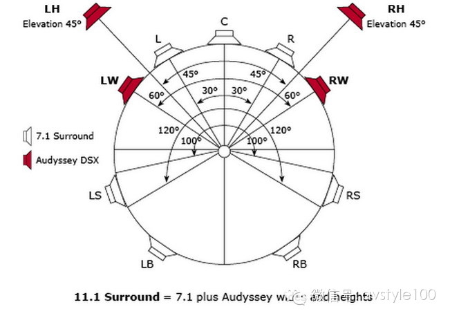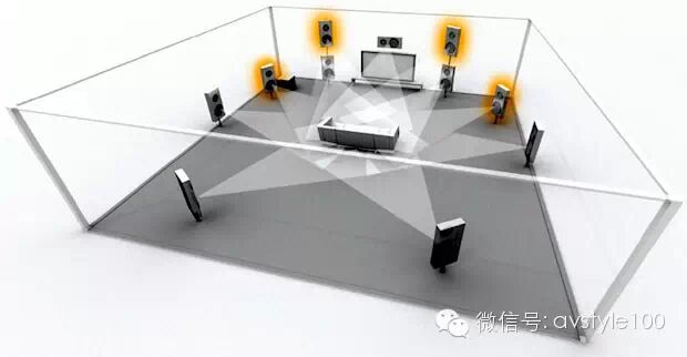 11.1輸出方式,在原來平面布置的7.1聲道的基礎上,增加了一對前方上環(huán)繞揚聲器輸出、一組前置寬環(huán)繞揚聲器輸出。