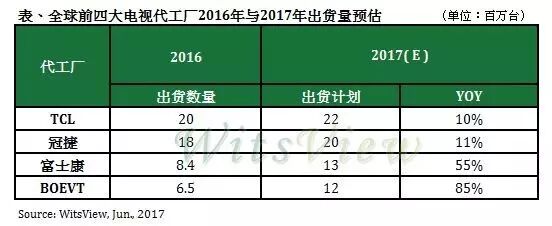 根據WitsView數(shù)據顯示,與2016年相比,全球前四大代工廠2017年出貨量預計都將成長,分別為TCL的2,200萬臺、冠捷的2,000萬臺、富士康的1,300萬臺以及BOEVT的1,200萬臺。