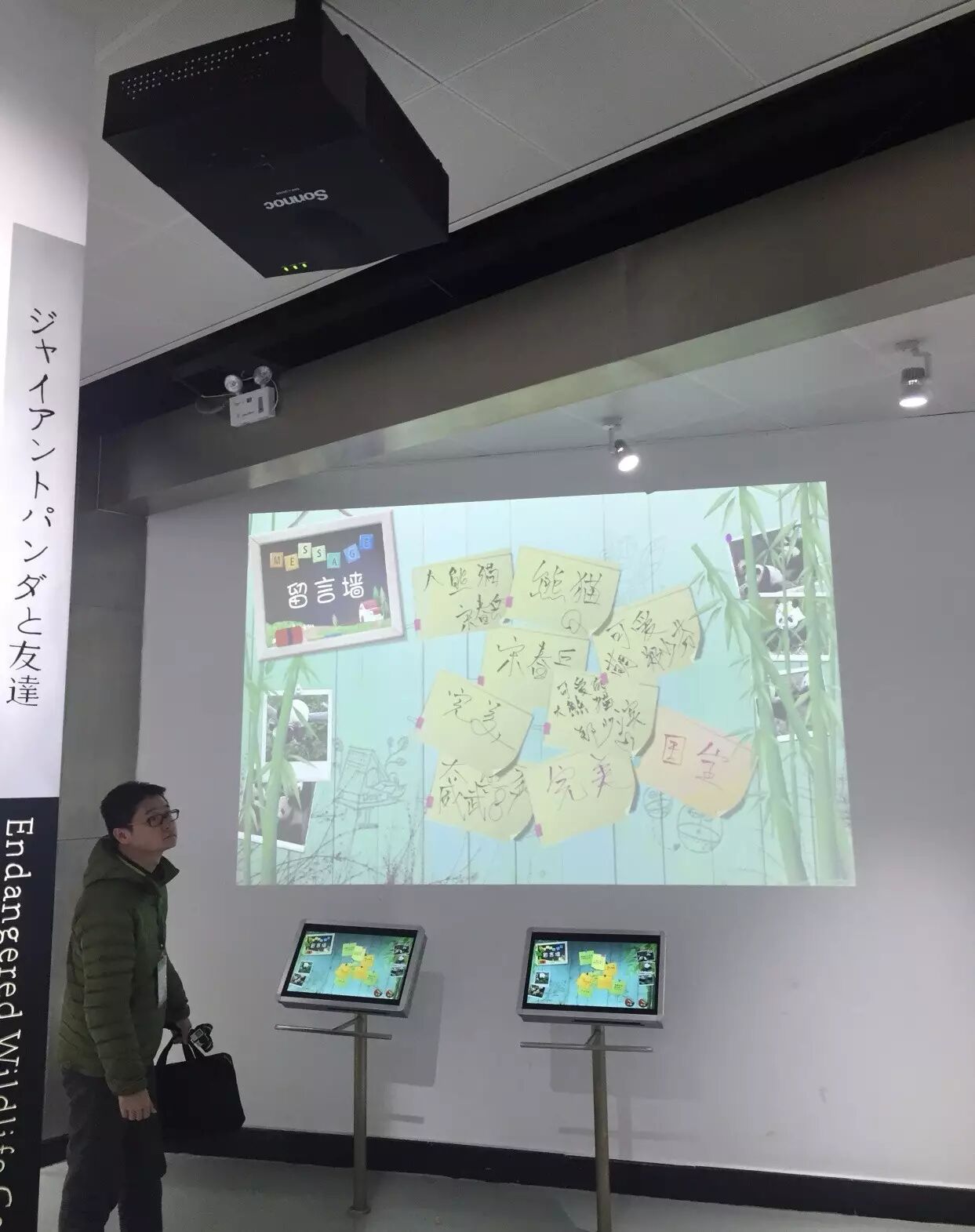 在熊貓科學(xué)探秘館多處用到投影顯示系統(tǒng),同時(shí)還可通過(guò)配套的觸摸屏實(shí)現(xiàn)互動(dòng)效果。比如,在全球聯(lián)系(大熊貓?jiān)谌蚍植迹┱鬼?xiàng)中,4臺(tái)索諾克Sonnoc激光投影機(jī)通過(guò)4通道融合,配合3臺(tái)21.5寸觸摸屏互動(dòng)實(shí)現(xiàn)顯示全球大熊貓分布及明信片發(fā)送等功能,即增長(zhǎng)知識(shí),又極具娛樂(lè)性。