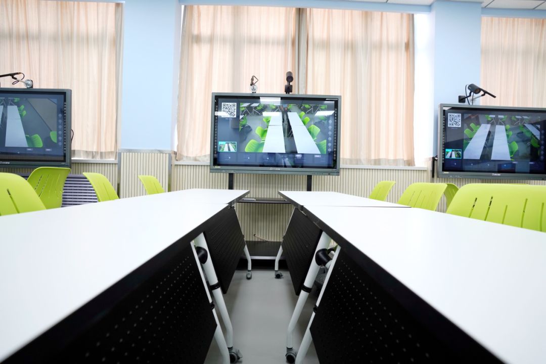 智慧教室內(nèi)設(shè)置了多塊高清電子屏,每臺電子屏裝有吊麥搭配攝像頭,用來記錄學(xué)生課題研討的整個過程,課后學(xué)生可以下載視頻對自己的研討思路進(jìn)行復(fù)盤總結(jié)。