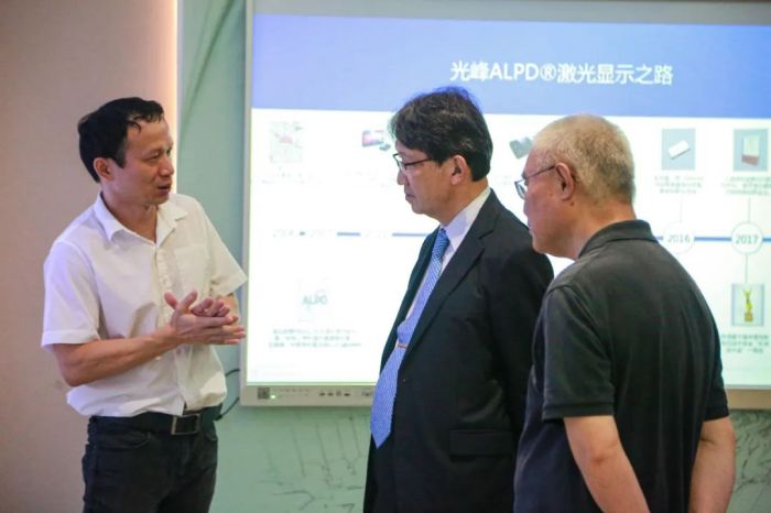 產(chǎn)、學、研各方專家在現(xiàn)場參觀光峰科技公司展廳、實地感受激光顯示和激光照明產(chǎn)業(yè)化的廣泛應(yīng)用場景之后,就半導(dǎo)體激光器的技術(shù)研發(fā)和產(chǎn)業(yè)化應(yīng)用等方面進行了廣泛而深入的探討。中野教授對中光研究院(中村實驗室)和光峰科技在激光領(lǐng)域所取得的成就表示贊賞,并分享了自己在相關(guān)領(lǐng)域的研究心得。他表示,非常贊賞光峰科技在激光熒光顯示技術(shù)方面做出的突破創(chuàng)新,對光峰科技在影院、工程、消費、車載等領(lǐng)域做出的產(chǎn)業(yè)化成果印象深刻。