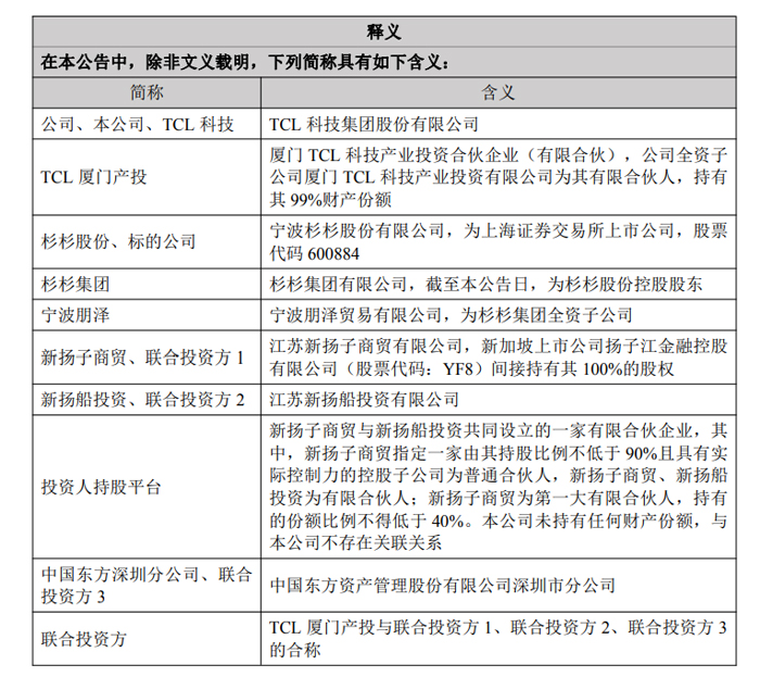 根據(jù)公告披露,此次重整的聯(lián)合投資方由 TCL 廈門產(chǎn)投、江蘇新?lián)P子商貿(mào)有限公司(下稱 “新?lián)P子商貿(mào)”)、江蘇新?lián)P船投資有限公司(下稱 “新?lián)P船投資”)及中國(guó)東方資產(chǎn)管理股份有限公司深圳市分公司(下稱 “中國(guó)東方深圳分公司”)共同組成,且已于 9 月 29 日與重整管理人、杉杉集團(tuán)、寧波朋澤簽署《重整投資協(xié)議》。