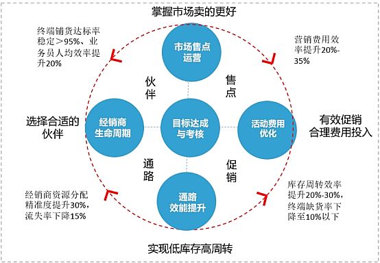 以建立數(shù)據(jù)驅(qū)動的經(jīng)銷商和終端精細管理體系為目標,以品牌商核心三大資源利用效能提升 (團隊、費用、渠道)為措施,達成覆蓋從品牌總部、區(qū)域到經(jīng)銷商和終端市場管理的高效通路運營,推動可持續(xù)業(yè)績增長。常見較為有效的可實施路徑包含:
