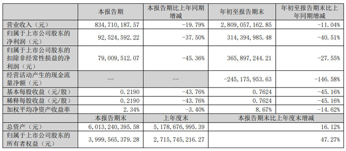 2025 年 1-9 月,公司累計實現(xiàn)營業(yè)收入 28.09 億元,同比下降 11.04%;歸屬于上市公司股東的凈利潤 3.14 億元,同比減少 40.51%;扣非后凈利潤 3.66 億元,同比下降 27.55%;久抗墒找媾c稀釋每股收益均為 0.7624 元 / 股,同比降幅達(dá) 45.16%;加權(quán)平均凈資產(chǎn)收益率 8.67%,較上年同期減少 14.62 個百分點。報告指出,凈利潤同比下降主要系主營業(yè)務(wù)毛利率較上年同期略有調(diào)整所致。