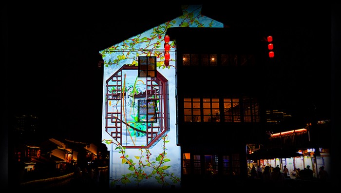 游客登船時(shí)可以欣賞正對(duì)碼頭的咖啡廳墻面光影秀。1臺(tái)巴可UDX在建筑外墻上投影春夏秋冬四季美景,以江南特色的“花窗”形式,呈現(xiàn)小橋流水、落葉繽紛的立體效果。