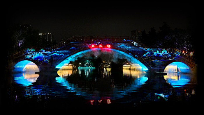 顯義橋?yàn)橐蛔坠皹颍?臺(tái)巴可UDX拼融投影覆蓋顯義橋一側(cè),在橋壁上投影出仙鶴飛躍山川的影像,飄逸動(dòng)人,仙鶴飛臨被古人稱(chēng)為“鶴瑞”, 寓意國(guó)泰民安。