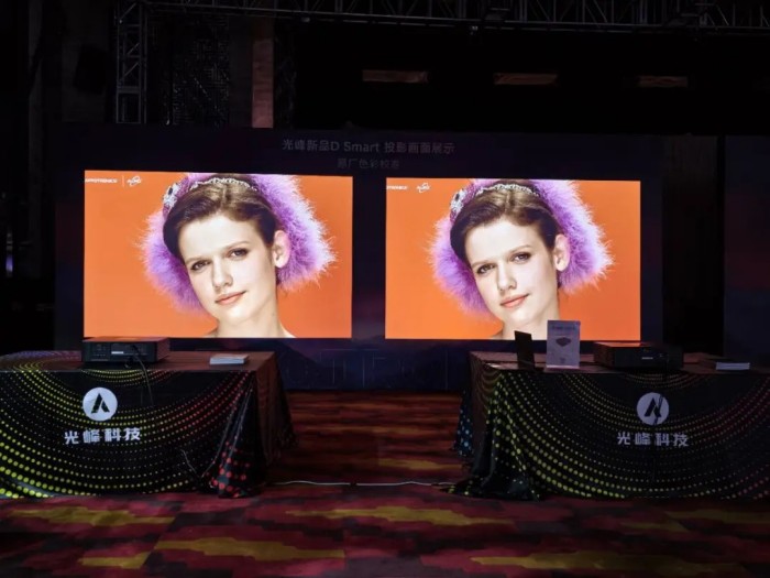 D Smart系列則聚焦室內(nèi)沉浸式大畫(huà)面需求,擁有4K超高清分辨率,亮度覆蓋6500-7800流明,現(xiàn)場(chǎng)通過(guò)雙機(jī)同場(chǎng)畫(huà)面對(duì)比,直觀(guān)展示D Smart的多屏同色功能及視覺(jué)表現(xiàn)力。