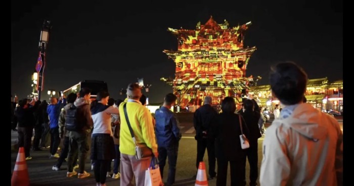 轉(zhuǎn)至戶(hù)外,鼓樓、太平樓的夜間光影秀則展現(xiàn)了光峰投影在大型建筑載體上的視覺(jué)表現(xiàn)力 :光峰工程投影皆應(yīng)用ALPD半導(dǎo)體激光光源技術(shù),投影過(guò)程不會(huì)對(duì)文物古跡造成光損害,同時(shí)色彩豐富的畫(huà)面與震撼的視覺(jué)特效疊加,讓歷史建筑在夜色中煥發(fā)生機(jī),完成了光影藝術(shù)的創(chuàng)意表達(dá)。